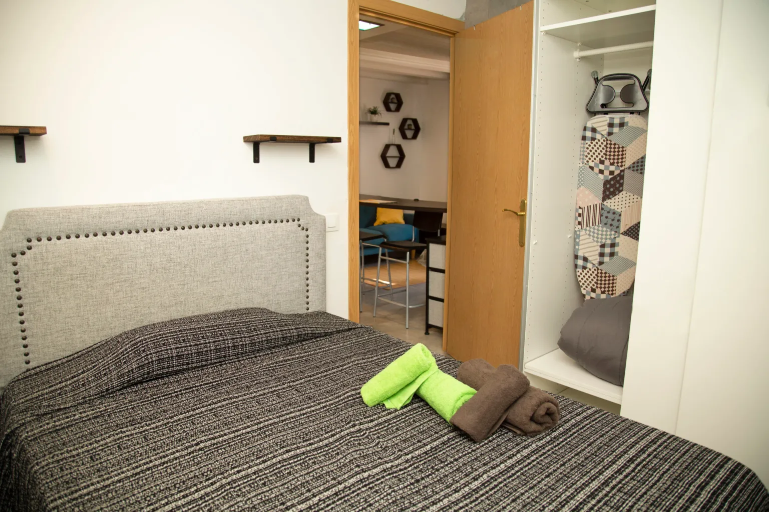 Cama, escritorio, silla, armario, mesita de noche, espejo, lámpara de noche y cerradura propia